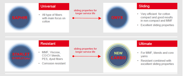 One of the key advantages of Bräcker travelers is their specialized finishing technologies. Different finishing types are designed to optimize friction behavior, improve wear resistance, and adapt to different spinning conditions. Bräcker offers several finishing options such as Saphir, Onyx, Pyrit, Zirkon, and the newest is Carbo. These finishing technologies help the traveler run smoothly on the ring, minimize heat generation, and extend the lifetime of the traveler while maintaining stable spinning performance.