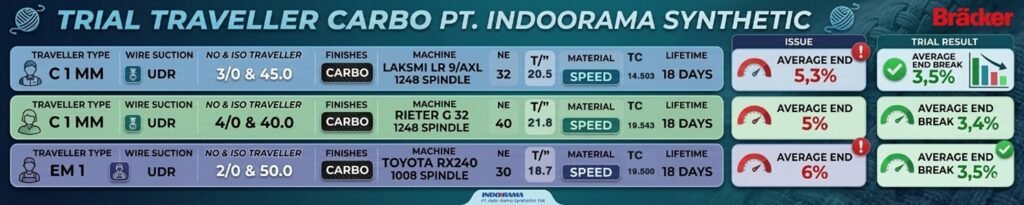 This is highly relevant in Indonesia, where many spinning mills produce yarns using synthetic or blended fibers. The Carbo finishing provides improved sliding properties, allowing the traveler to move more smoothly along the ring and reducing friction during high-speed spinning. Lower friction helps minimize heat generation on the ring and supports more stable spinning conditions.